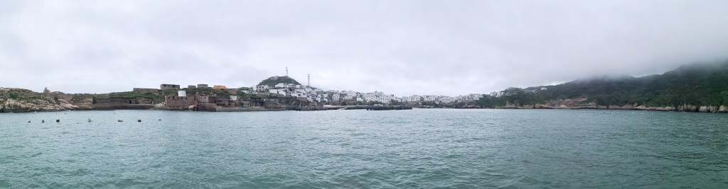 早起窗外浓雾上新帘,海风拨不动。八点光景,方散开些。登船出海,回望嵊泗已是白绫拦腰环山娇,青山横抱瘦绫窕。