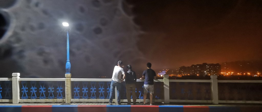 晚餐后登高观景台上,眺望灯火夜阑珊。海风中鲜咸漫透,农历十六月正圆…