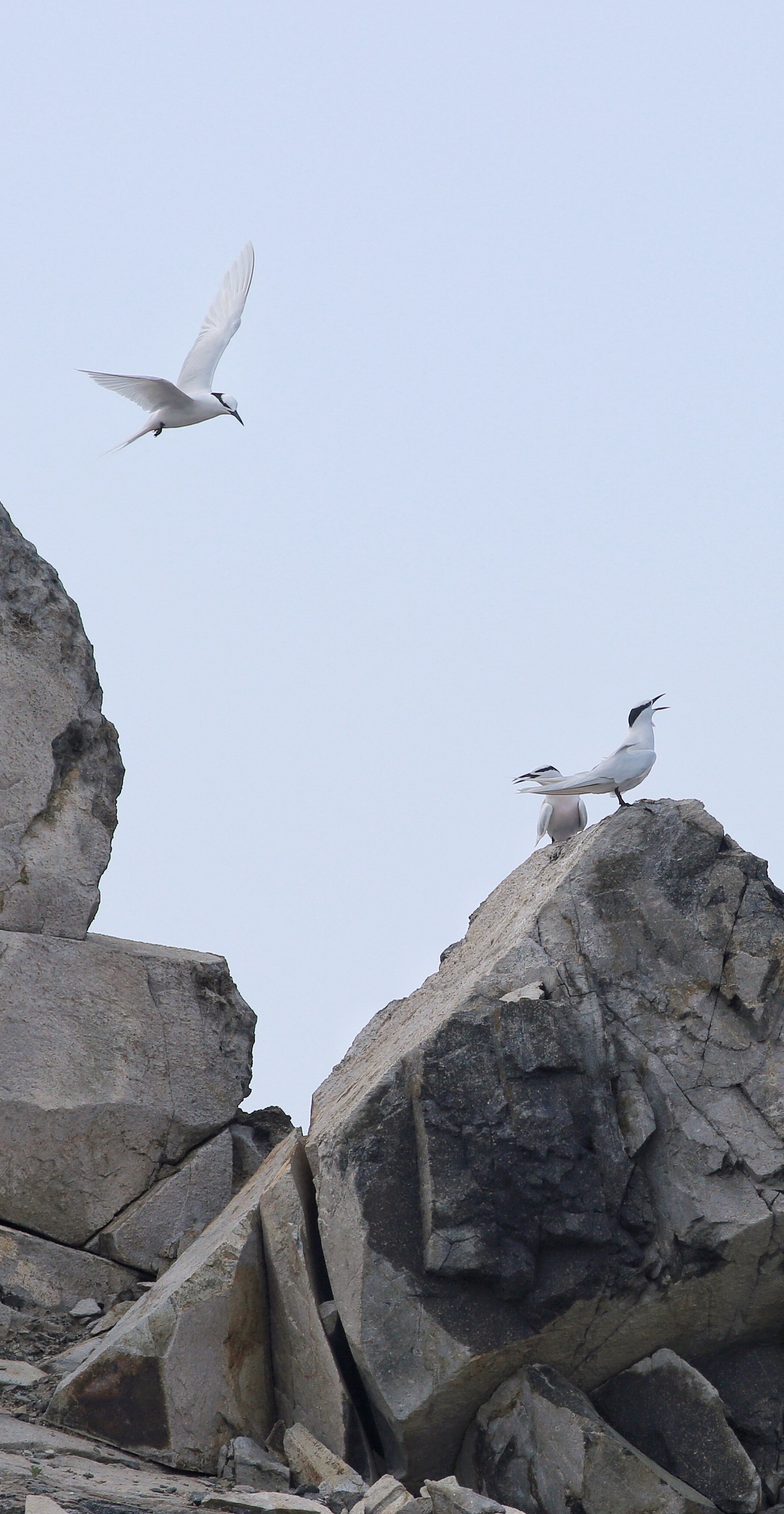 船尾马达声停,四下独留浪漫。观察发现这个小团体由七八个家庭组成,像是约上了哥们儿或姐妹走个小众路线度蜜月。雄鸟半展双翅昂首高歌,雌鸟回首梳羽试风和鸣。黑枕燕鸥延伸后脑勺的黑色丝巾贴合枕部,粉红燕鸥不知是何色号的靓喙明蹼撩动蔚蓝海天固有的冷色调。细浪拍岸,漫上岩头,也漫上心头…